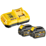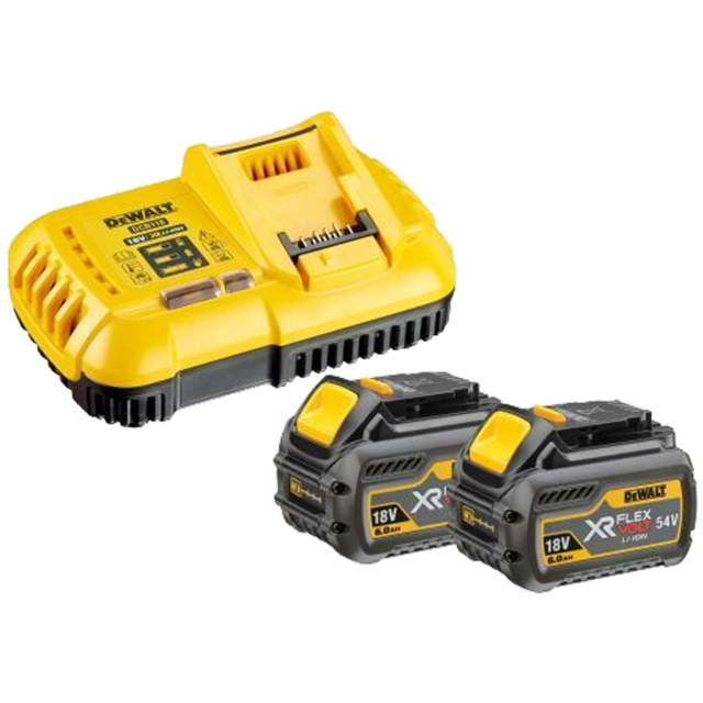 Das DeWalt Akku-Starterset besteht aus einem 18 V / 5,0 Ah Li-Ion XR Akku und dem Schnellladegerät (DCB1104).